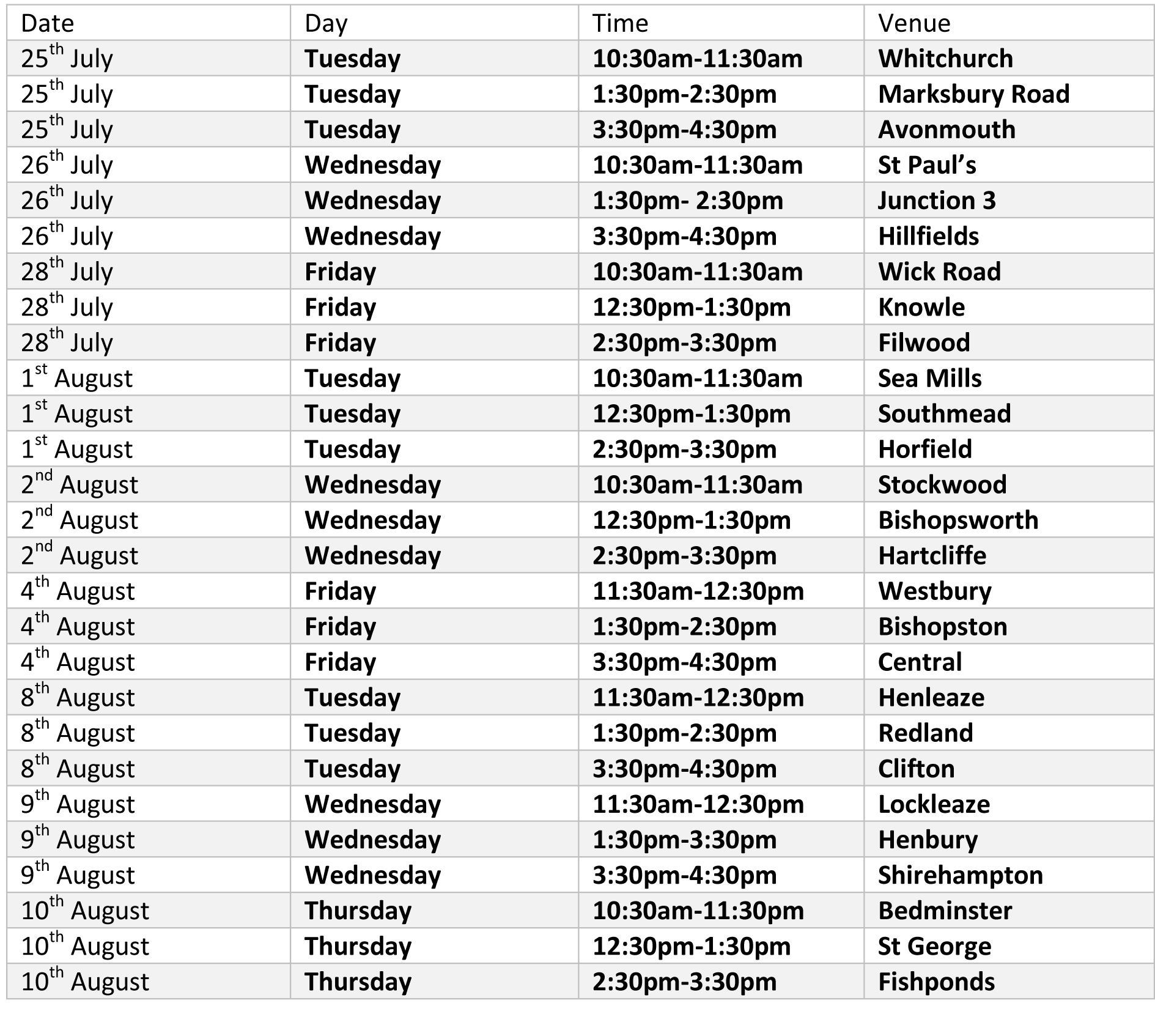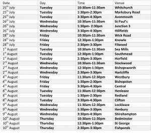 Children at the libraries will be invited to make masks of the characters and then act out the stories while Kirsten reads them. Every Library in Bristol will get a visit from the team and the schedule is below: