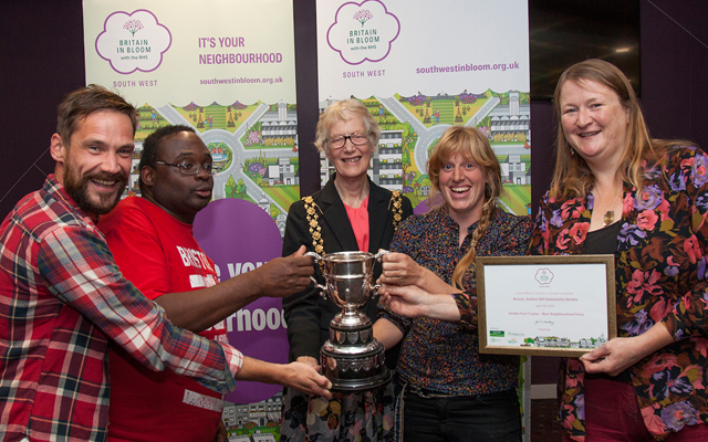 Best in the South West! RHS Its’s Your Neighbourhood Gordon Ford Trophy awarded to Golden Hill Community Gardens at the Britain in Bloom – Garden for Bristol Awards 2015 www.southwestinbloom.org.uk October 1st 2015 South West in Bloom celebrated the Garden for Bristol Awards 2015 at the Bristol City grounds in which Golden Hill Community Gardens was awarded Best in the South West from the Royal Horticultural Society (RHS) It’s Your Neighbourhood Campaign. They were awarded best out of 600 participants in this category for their commitment to community projects and Green endeavours. Golden Hill Community Gardens opened in 2012 and has become a hub for gardening activities for community groups, neighbourhood schemes and local schools. Garden co-ordinator, Lucy Mitchell, who attended the ceremony with volunteer gardeners, started that: “We are overjoyed to receive this award. We have gone from strength to strength and have been able to further our community work this year with thanks to the help of our hard working and committed volunteers” Spring 2015 saw the opening of the Bishopston Bale House, a straw bale, eco building made with renewable materials and based on traditional building methods. This Bale House is used by charities, local organisations, schools and toddler groups and provides space for gardening talks, demonstrations and a place to shelter during the outdoor activities and fairs that take place on the site throughout the year. The site’s eco credentials are further boosted by a solar powered water pump which draws water from an underground well to two rain water tanks at the top of the site. They can pump around 500 litres an hour to the community garden and allotments without the need for mains water and ensure sustainable and responsible use of water on site. Golden Hill Community Gardens are open to the public every Wednesday 10am – 4pm and Saturday 11am – 2pm. Golden Hill Community Gardens, Bishopston, Bristol BS7 8EN. www.thegoldenhillcommunitygarden.com
