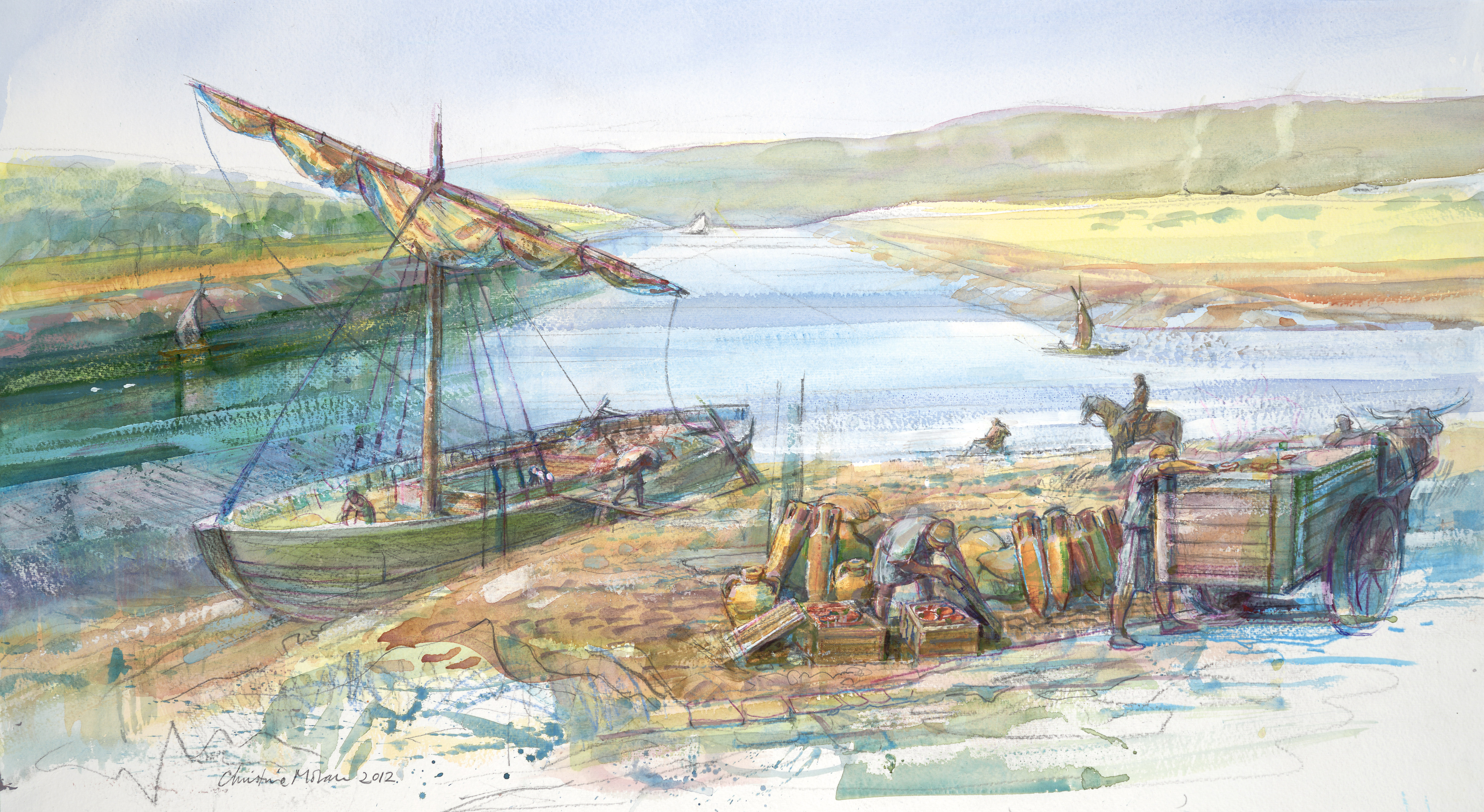 Christine Molan’s collection brings Bristol’s early history vividly to life in paintings based on recent Roman discoveries at Sea Mills and Medieval Bristol Castle. The recent discoveries include a rare Roman port at Sea Mills which has “revolutionised thinking about Roman Bristol” according to Bob Jones- BCC Archeo officer 2012. Christine’s own father dug up a hoard of Roman Mediterranean pottery on his allotment beside by the Avon in the 1960’s.