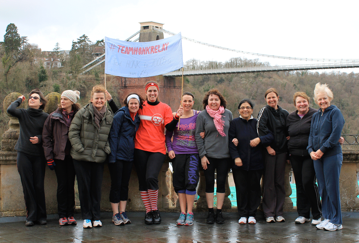 Team Honk was set up by a group of bloggers 3 years ago to help Comic relief use social media as a fund raising tool, with the three founders joining the comic relief team in Africa for live blogging each year. In the first year team members did lots of silly things individually to make money, in year 2 (for Sports Relief) we joined together for a baton relay from Land’s End to John O’Groats. On the Bristol leg we had a Zumba flashmob in Clifton and juggled our way across the suspension bridge.