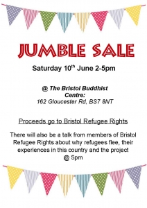 Jumble Sale on 10th June from 2-5 at the Bristol Buddhist Centre , 162 Gloucester Rd. It is money being raised for Bristol Refugee Rights.